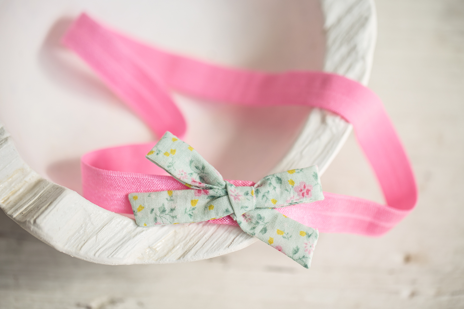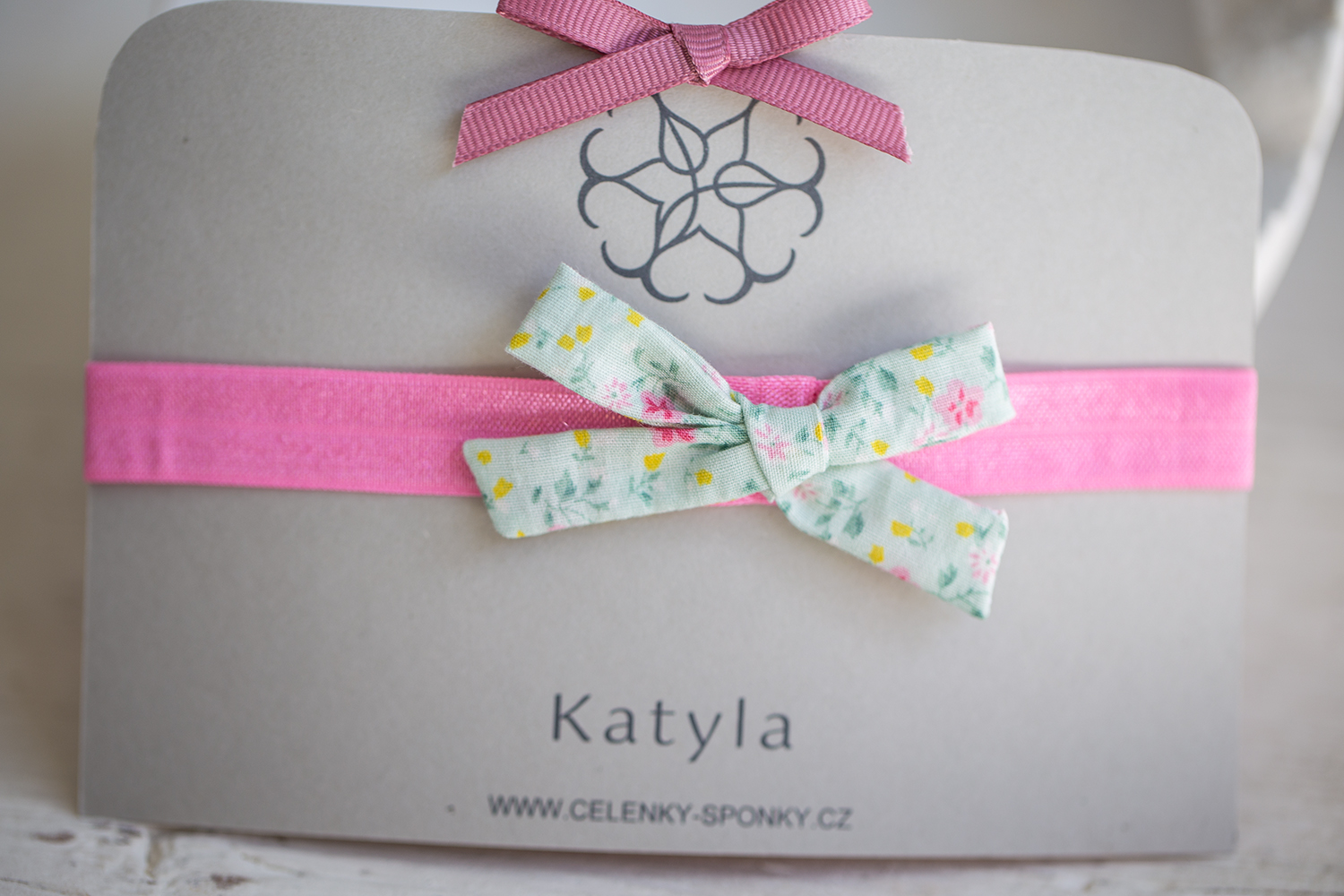 Krásná růžová výrazná čelenka na gumce, krásně pruží. Mašlička je z ušité bavlněné látky zelenkavé barvy s jemnými kytičkami.