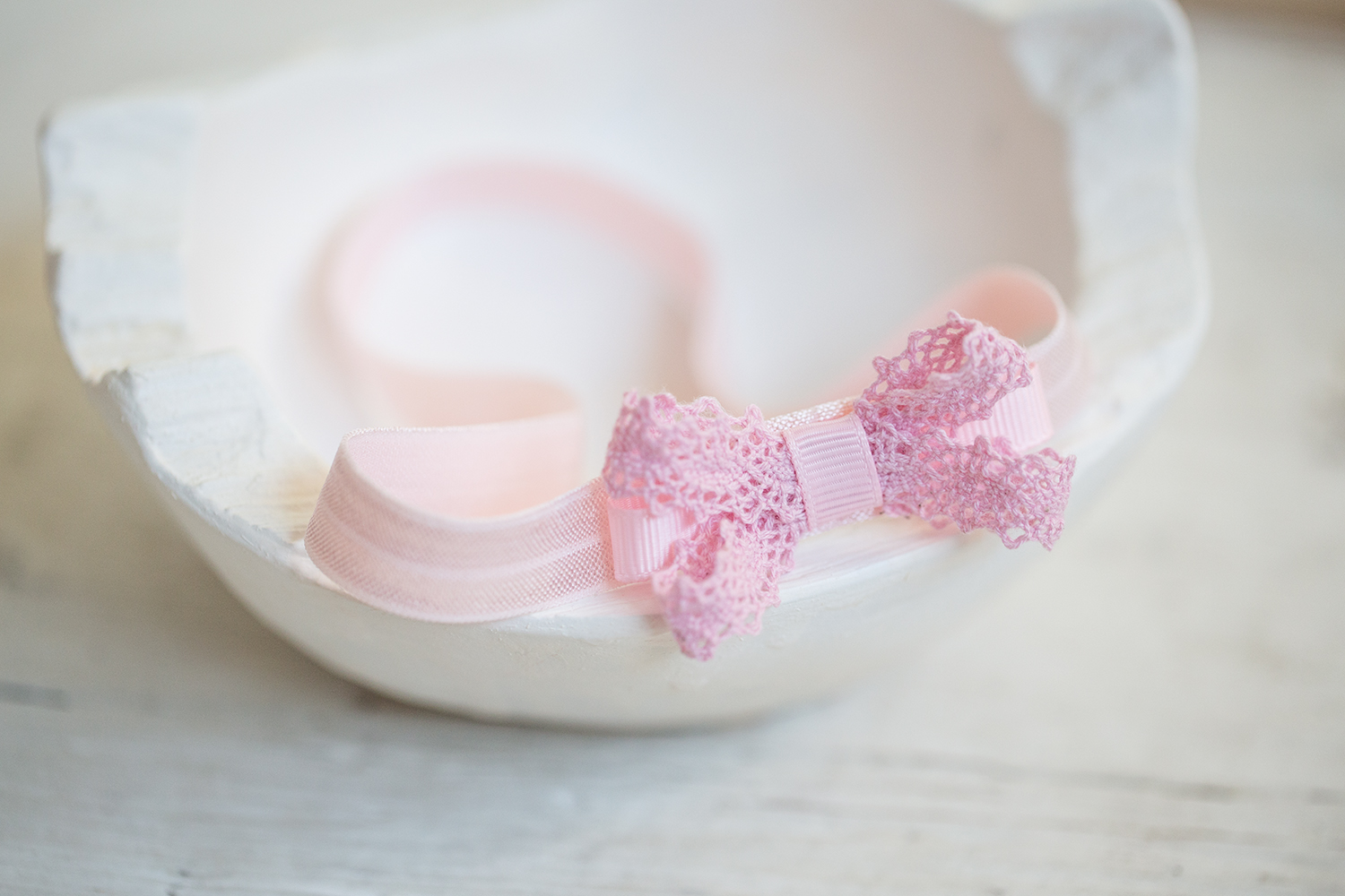 Dětská jemná romantická čelenka ve světle růžové barvě. Krajková mašlička působí něžně.Vhodná na focení a vyjímečné dny, jako oslavy, křitny.,