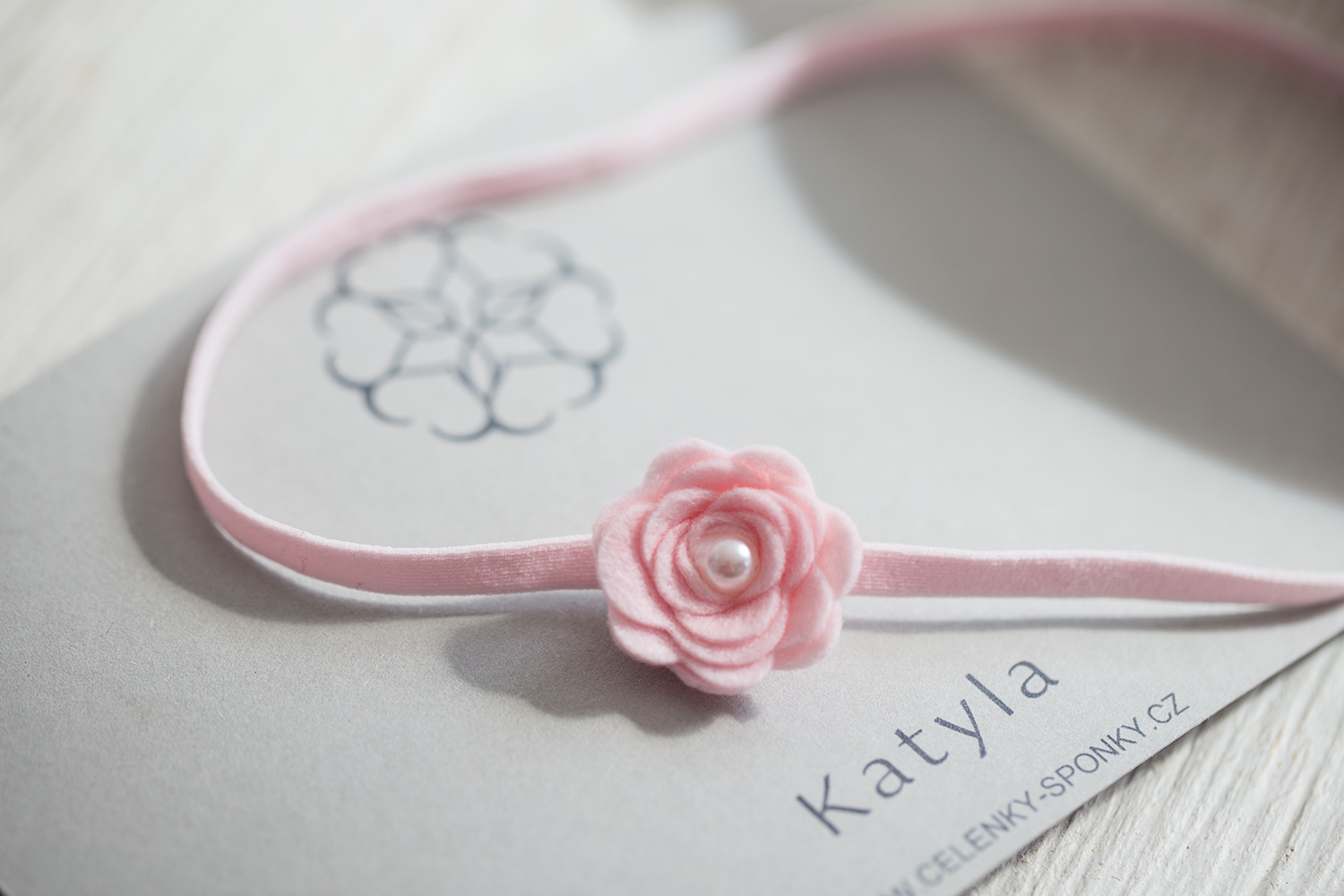 Dětská čelenka do vlasů pro holčičky na jemné gumičce. Čelenka je světle růžová se světle růžovou květinkou a perličkou.Vhodná na první focení,společné chvíle.