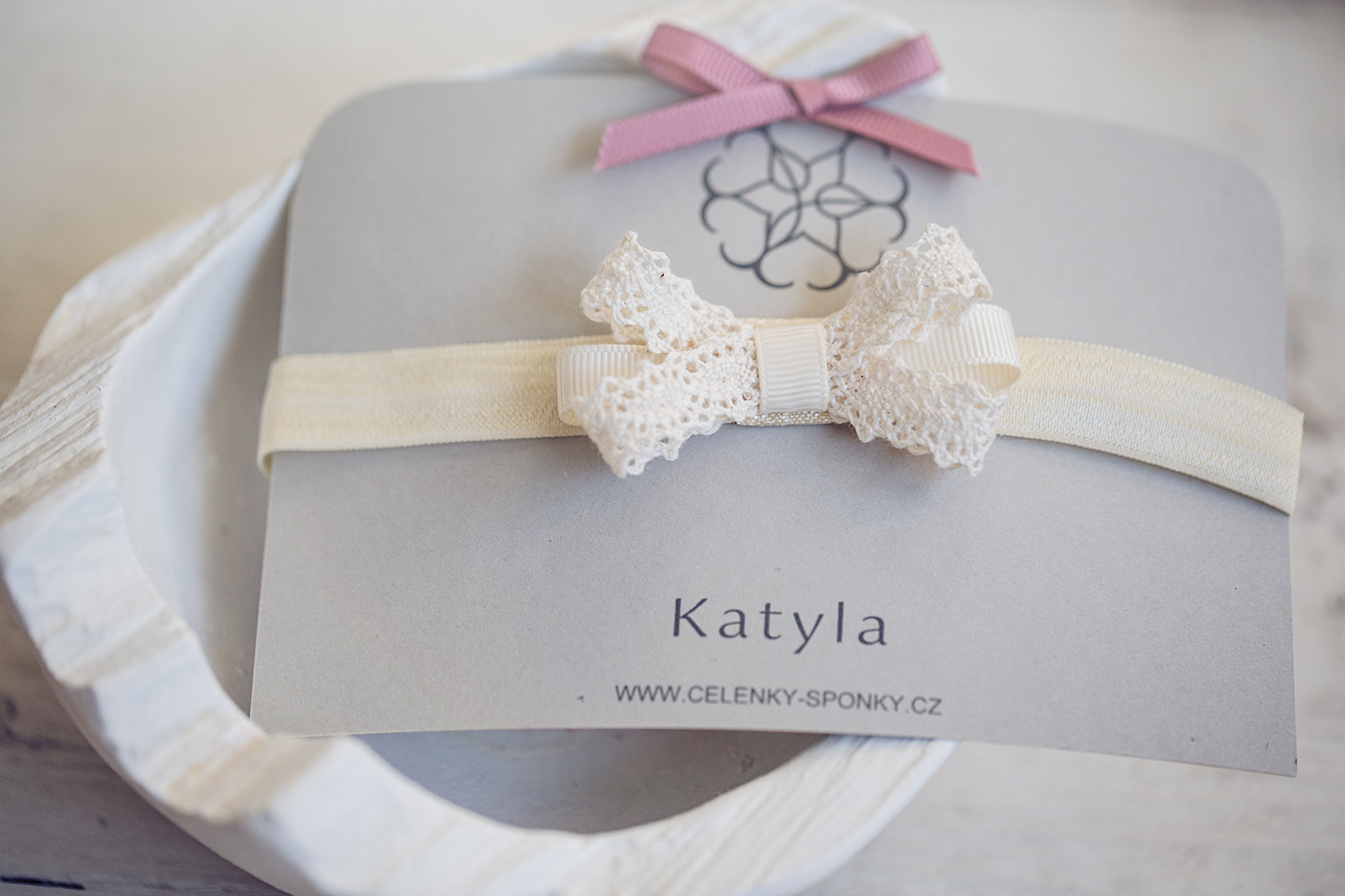 Dětská čelenka na gumce s mašlí z krajky – Smetanová