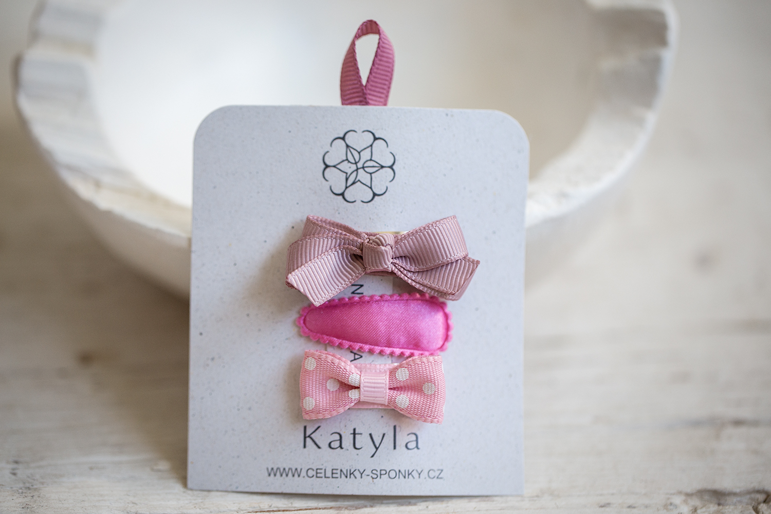 Jemné dětské sponky pro holčičky, ideální i do prvních vlásků.Set obsahuje tři ladící sponky v růžových barvách s mašličkou.