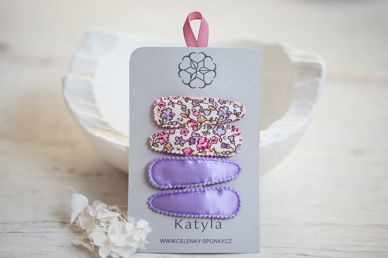 Luxusní dětské vlasové sponky do vlasů, saténové lila fialová barva a fialkovo růžové sponky s květy. Pohodlné na nošení a zároveň krásné výrazné svěží i na slavnostní nošení k šatičkám.