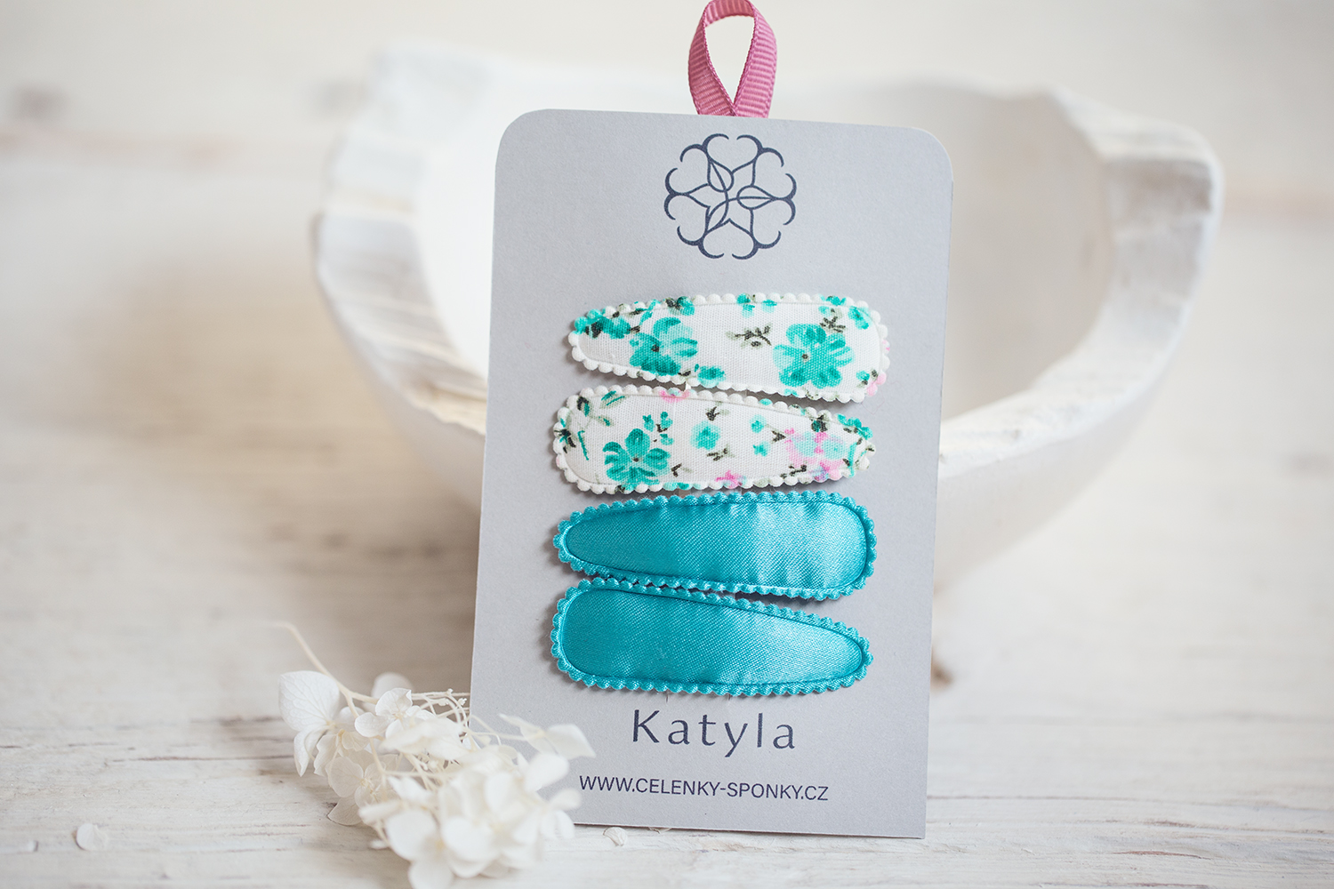 Luxusní svěží sponky do vlasů. Saténové mentolově zelené sponky a květinové bavlnéné dětské sponky. Dětské sponky jsou pohodlné na nošení a dobře drží.