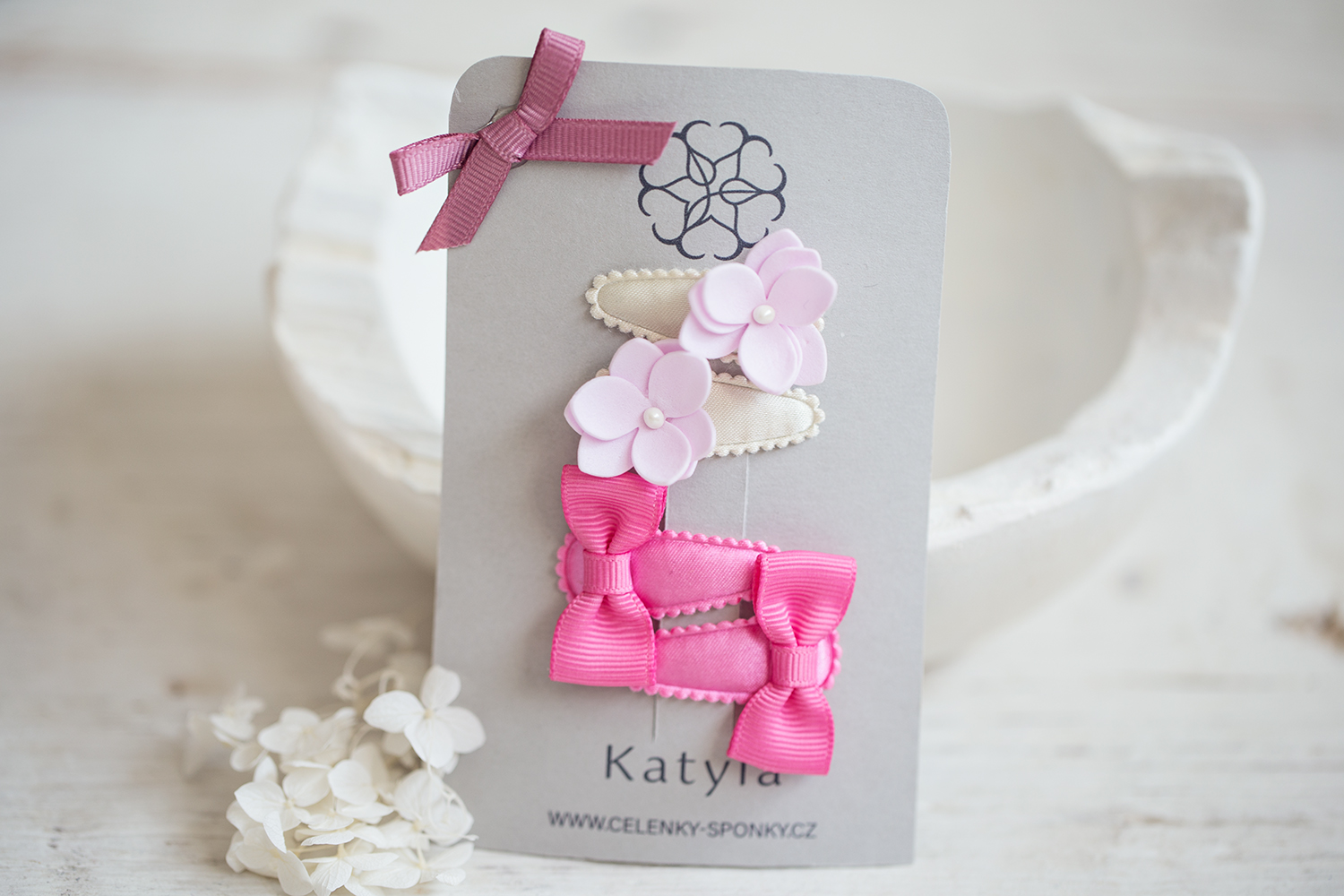Saténové smetanové sponečky s růžovými květy a sladce růžové saténové sponečky s mašličkami.