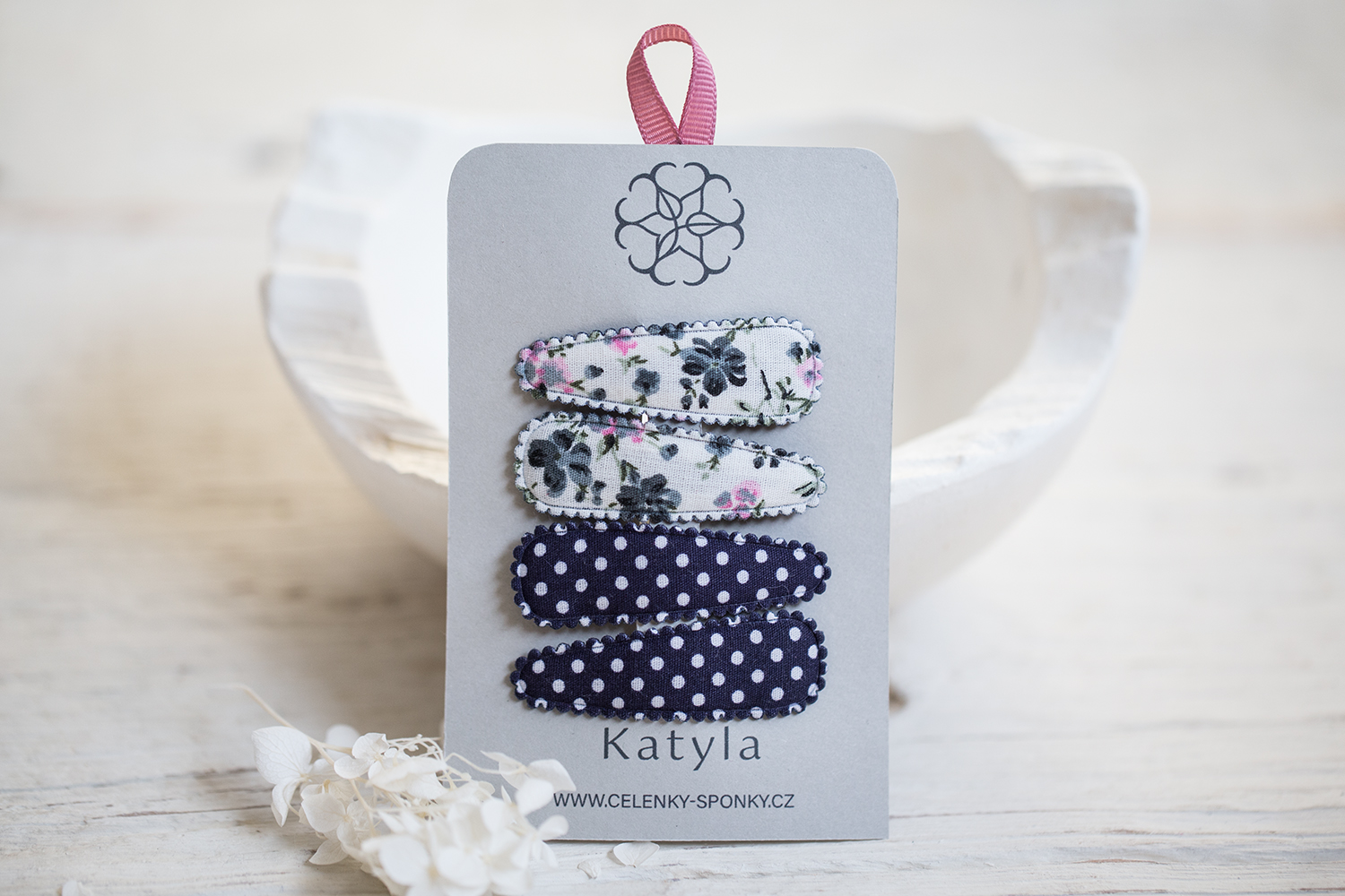 Dětské sponky do vlasů v tmavomodrém odstíny s puntíky a druhý pár s modrými a růžovými květy. Sponky jsou bavlněné s kráným výrazným vzorem oblíbené barvy.