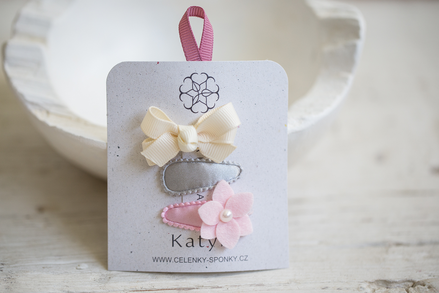 Sada jemných dětských sponek v krémové, šedé a růžové barvě. Sponka s mašličkou je smetanová, saténová šedá sponka a růžová saténová sponka s květinou a perličkou.