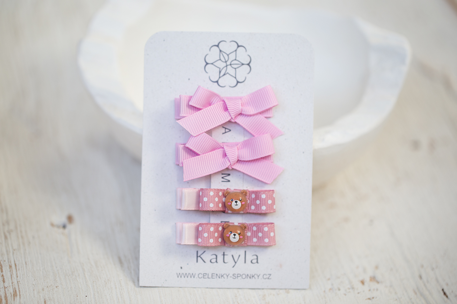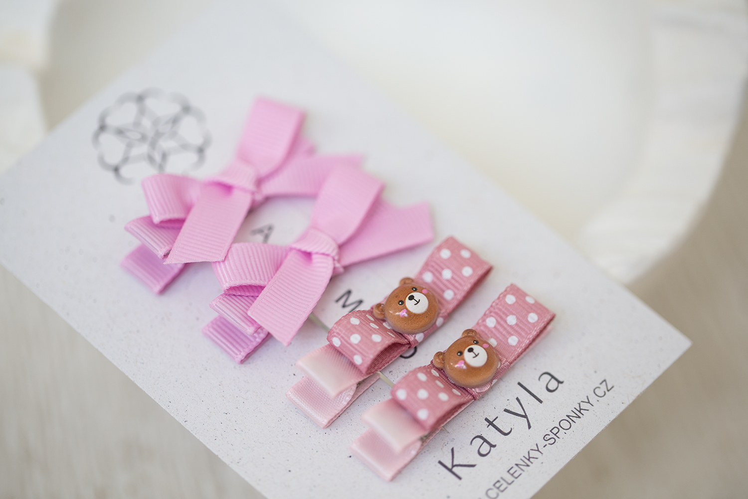 Dokonalá výbava dětské sponky v laděné do setu. Růžové mašličky v tulipánové růžové barvě a puntíkaté mašličky s medvídkem. Pro každou malou a velkou parádanici pro každý den.