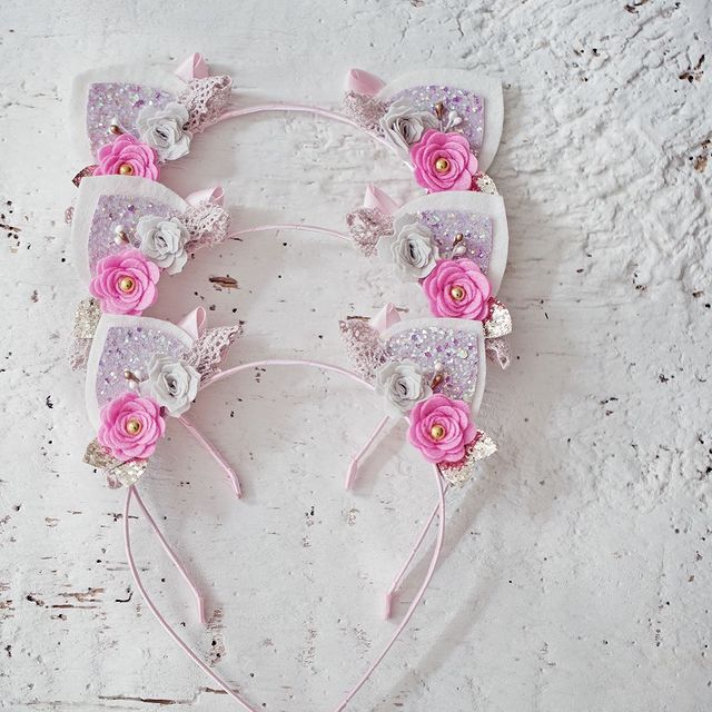 Krásná čelenka do vlasů s oušky pro malou kočičku. Čelenka je rozkošná, zdobená květinkami.krajkami, saténové stuhy, třpytivé lístky,perličky..