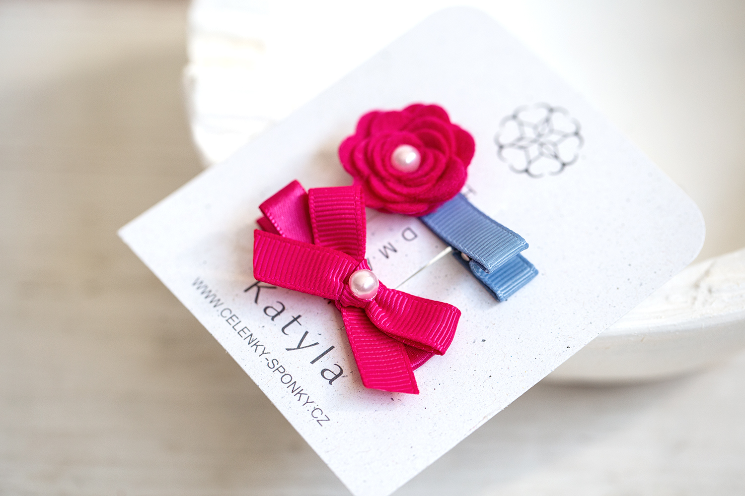 Dětský set sponek do vlasů v kombinaci jemné mašličky a květiny s perličkou. Růžově malinová kytička a mašlička. Roztomilý sladěný set pro každou malou parádnici. Dva styly,ale jeden roztomilý účes.