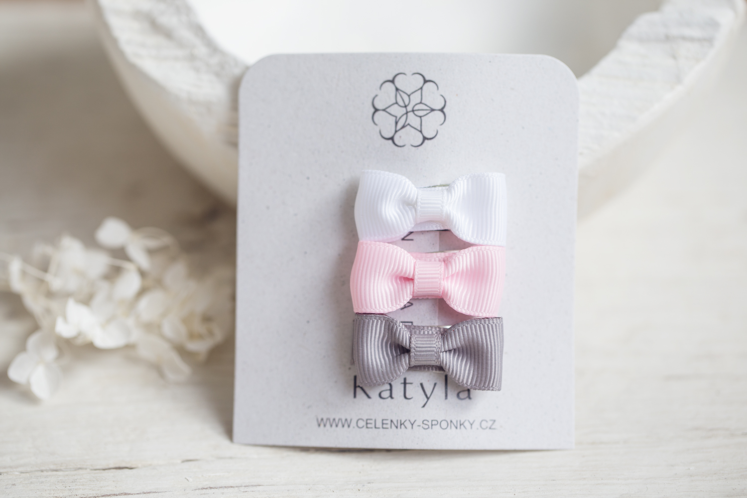 Malinké roztomilé mašličky do vlásků z kvalitní stuhy.Mašlička je bílá,světle růžová a šedá.