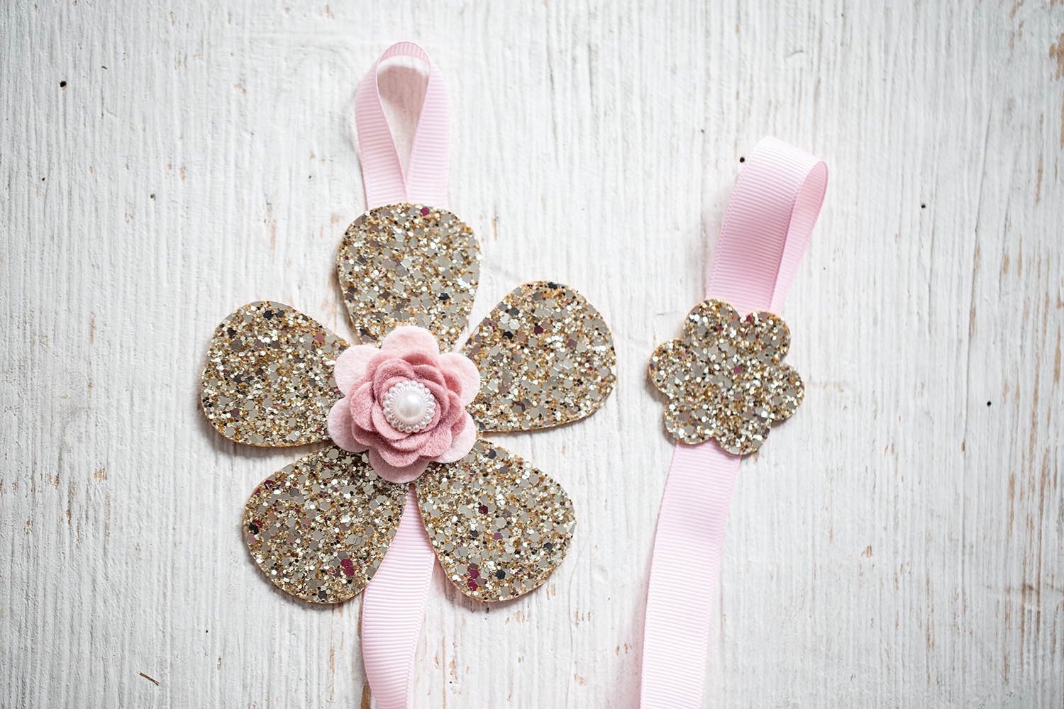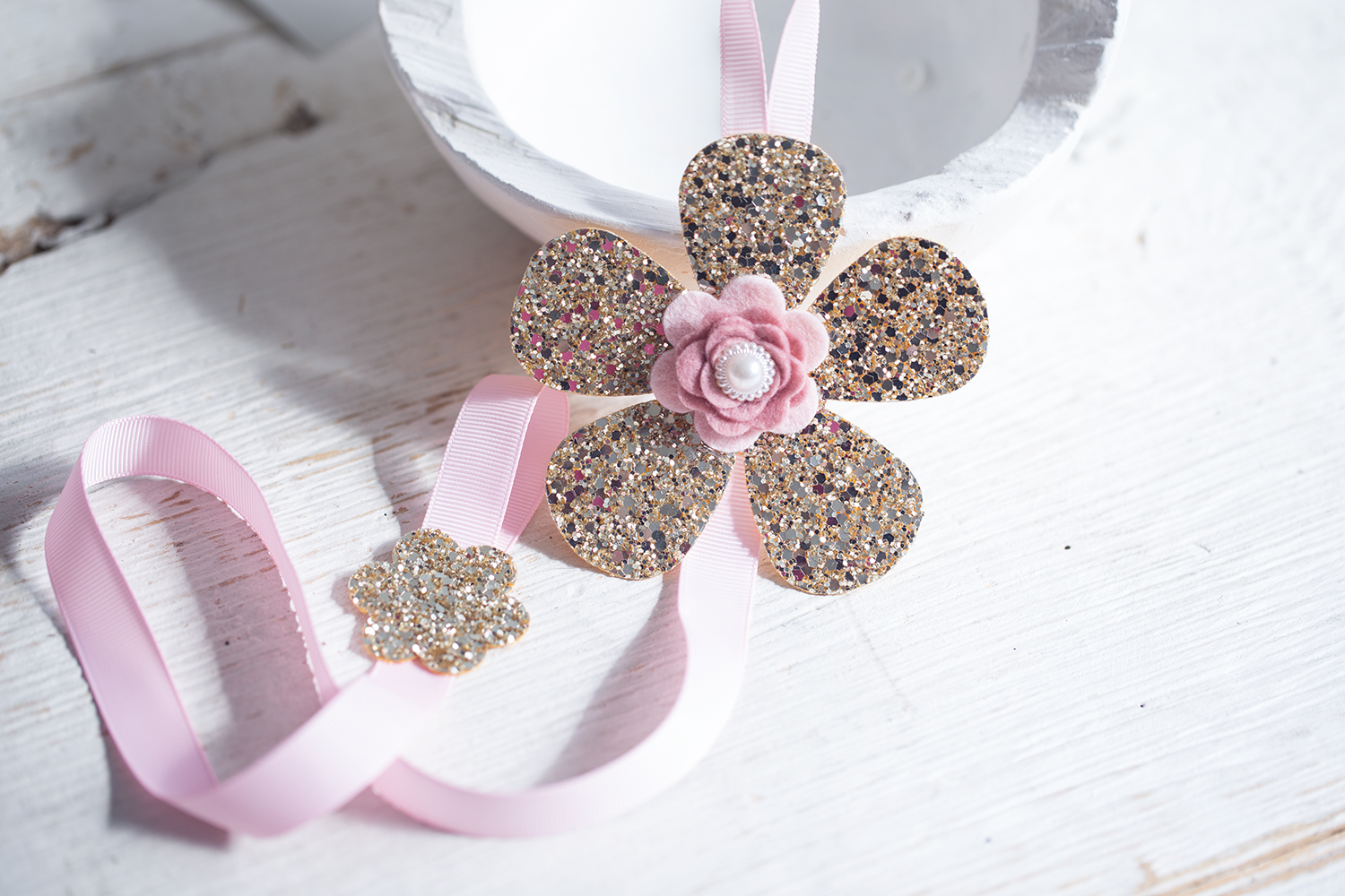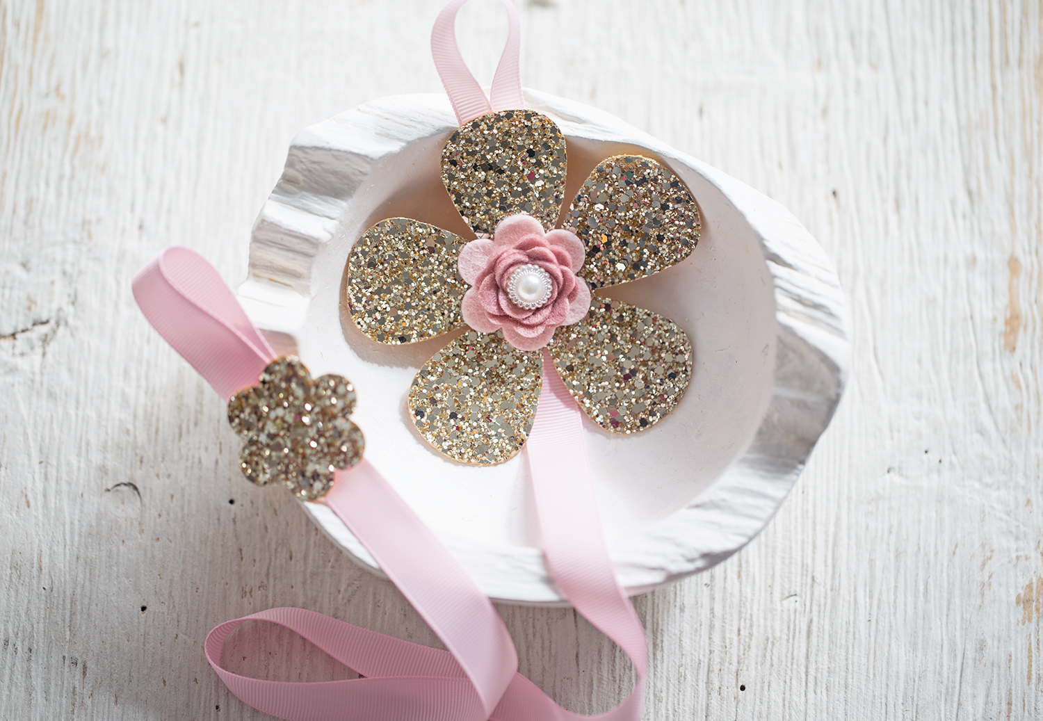 Sponkovník třpytivá zlatá květina s růžovou stuhou, nazdobená růžovou květinkou s perličkou. V pokojíčku na pověšení, Krásné místo pro tvé sponečky, aby měly své místo.