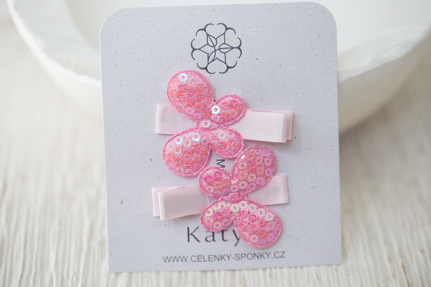 Třpytivě světle růžové motýlky do vlásků, krásně se na sluníčku třpytí a lesknou.